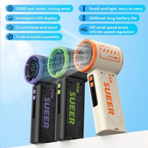 Model: S-17 “Powerful Wind” Features: Digital LED display for speed settings. 150 adjustable speed levels for customized airflow. Turbine blade